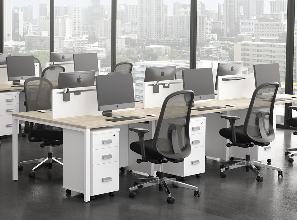 Tampo bipartido confeccionado em BP 25mm com fita de borda 2mm; pés em formato quadro 50x30mm em aço carbono; niveladores de altura; travessas tubulares em aço carbono; moldura plástica para acesso à fiação.