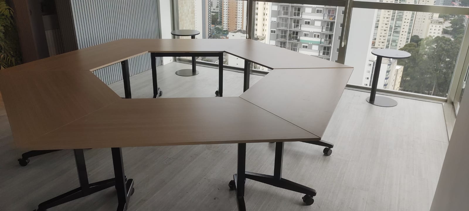 Tampo: em MDP 18mm #25mm com acabamento fita PVC 2mm Travessa : em tubo metalon 50x30 com reforço em chapa de aço Pés: inferiores com base repuxada com rodízios de 65 [mm] todos com trava Travamento: ManÍpulo com rosca ¼’’ para travamento do tampo a estrutura